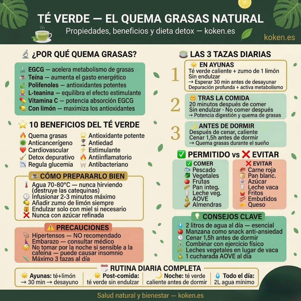 ⚠️ Precaución: Por su contenido en teína, el té verde no es recomendable para personas hipertensas ni para consumo en grandes cantidades durante el embarazo. Consultar con el médico en caso de duda.