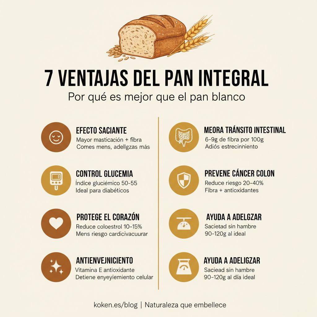 El pan integral es claramente superior al pan blanco en todos los aspectos nutricionales. Sus 7 ventajas principales lo convierten en un alimento imprescindible para una dieta saludable: