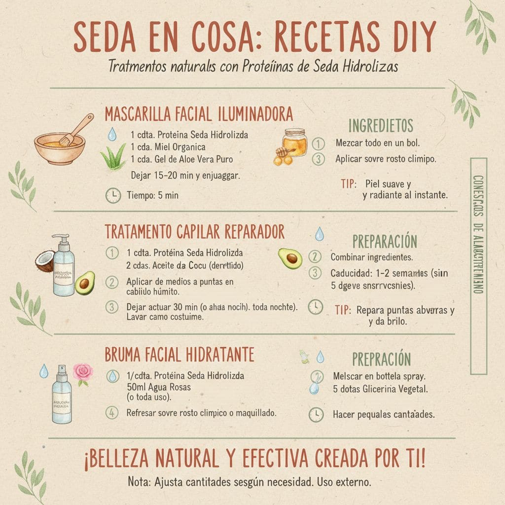Ya sea que elijas productos comerciales de alta gama o te atrevas a crear tus propias formulaciones caseras, las proteínas de seda te ofrecerán resultados visibles y duraderos. Su versatilidad permite que puedan incorporarse fácilmente en cualquier régimen de belleza, adaptándose a las necesidades específicas de cada tipo de piel y cabello.