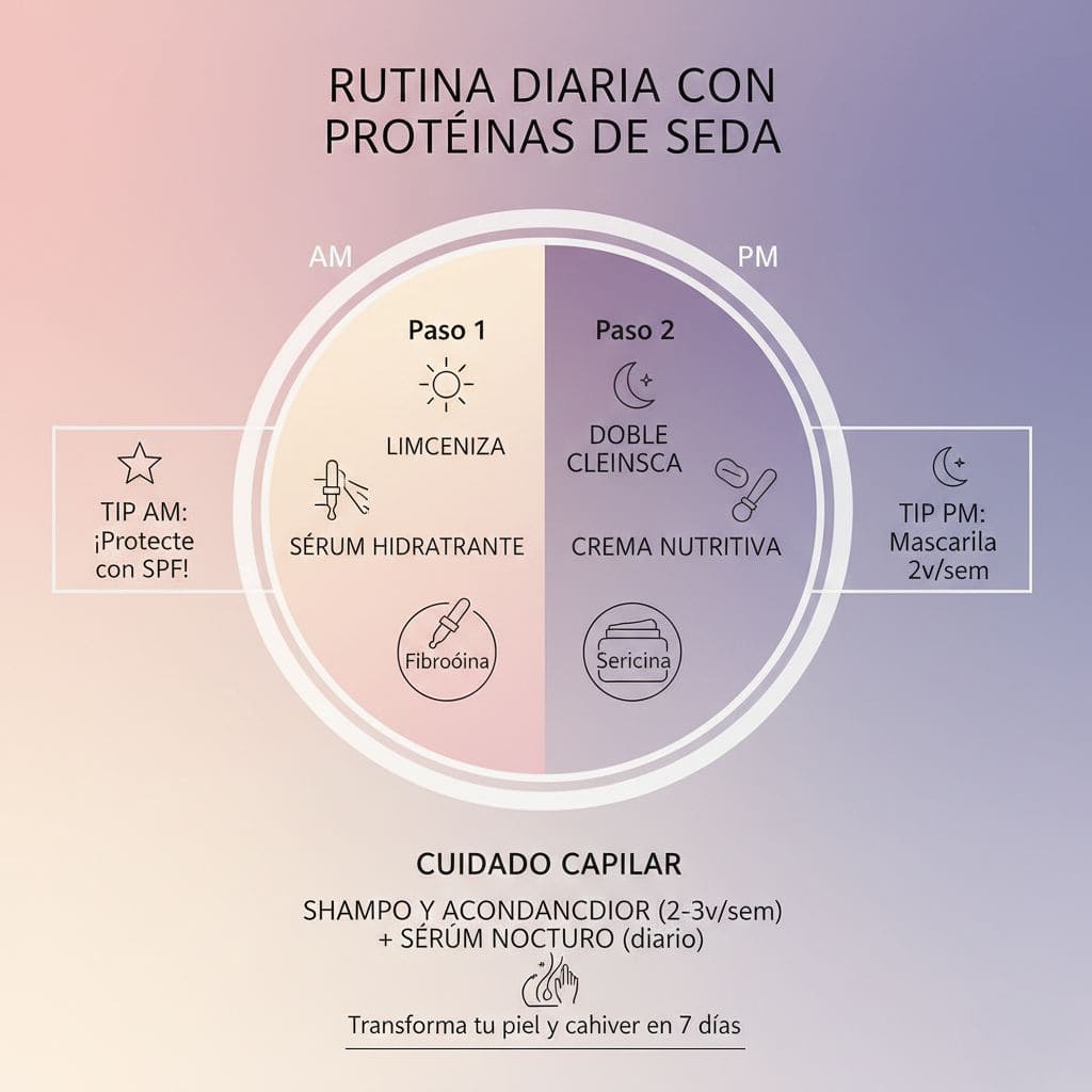 Aplicación: Utiliza productos con proteínas de seda después de la limpieza y tonificación, antes de la crema hidratante.