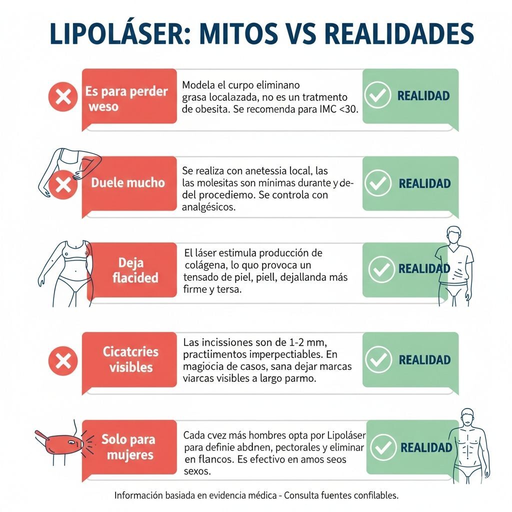 Existen numerosas creencias erróneas sobre el lipoláser que pueden generar expectativas poco realistas o dudas infundadas. Es fundamental separar los mitos de las realidades para tomar una decisión informada sobre este tratamiento.