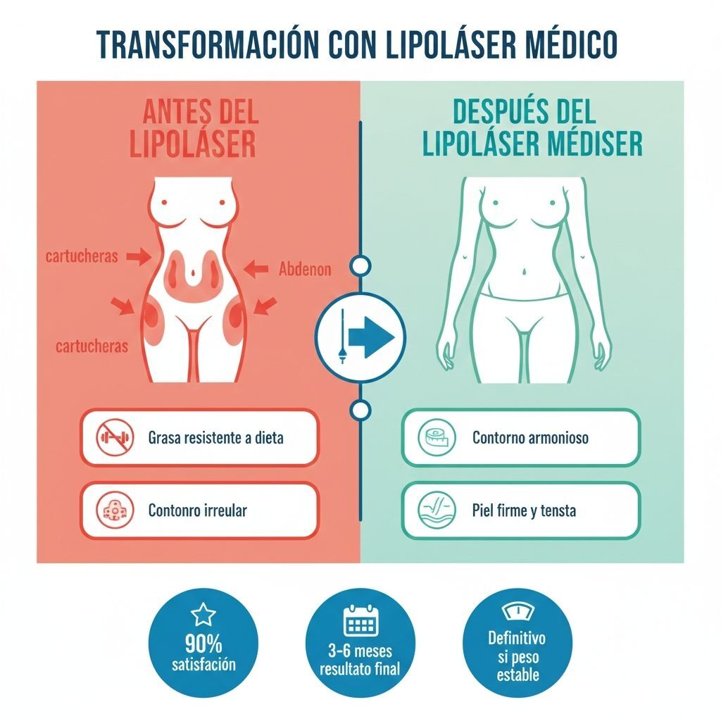 El lipoláser está diseñado para remodelar el contorno corporal eliminando depósitos de grasa localizada, no para bajar de peso general. Se recomienda para personas con IMC menor a 30 que tienen zonas específicas de grasa resistente a dieta y ejercicio.