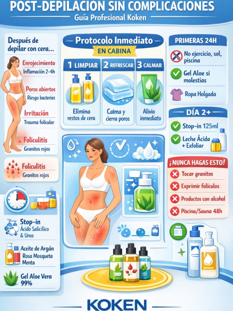 El cuidado post-depilatorio profesional es lo que diferencia un servicio estándar de uno excepcional. Los granos, irritación y foliculitis después de la depilación con cera son complicaciones completamente prevenibles si se aplican los protocolos adecuados con productos profesionales de calidad.