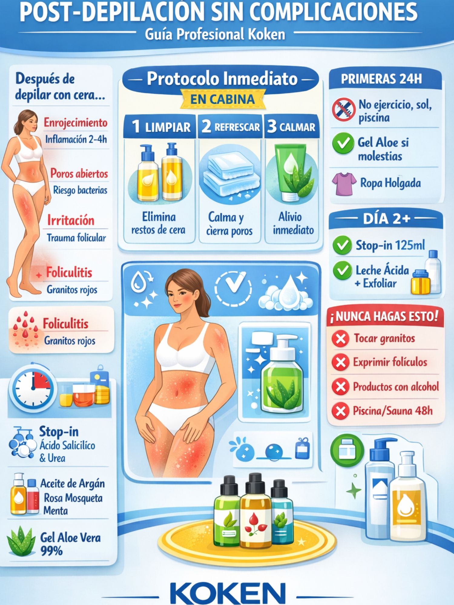 ¿Necesitas productos post-depilatorios profesionales de máxima calidad? Descubre la gama completa de productos Koken, formulados específicamente para prevenir foliculitis, calmar irritaciones y garantizar una piel perfecta después de cada sesión de depilación con cera.