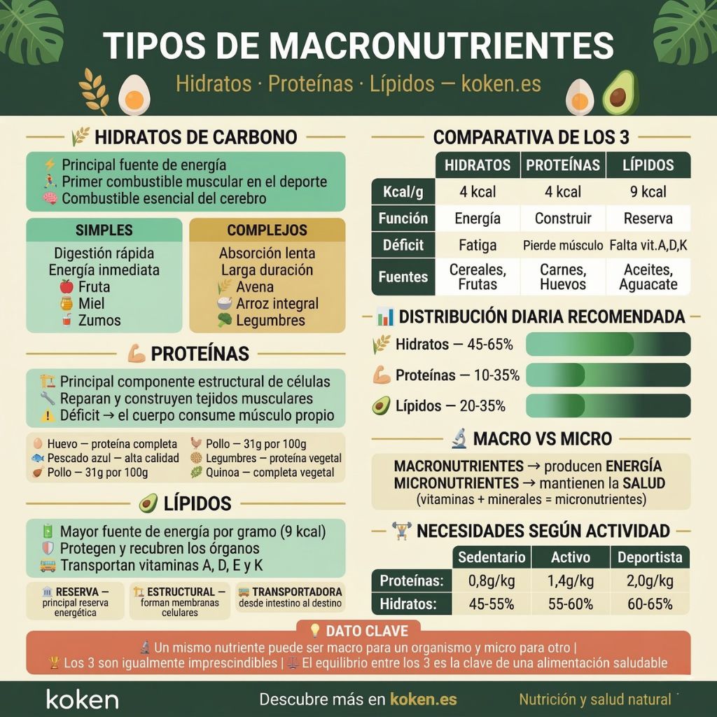 ¿Es lo mismo macronutriente que macrominerale? No. Los macronutrientes son los tres grupos principales que aportan energía: hidratos, proteínas y lípidos. Los macrominerales son minerales necesarios en grandes cantidades como calcio, fósforo o magnesio, y pertenecen a la categoría de micronutrientes ya que no aportan energía directamente.