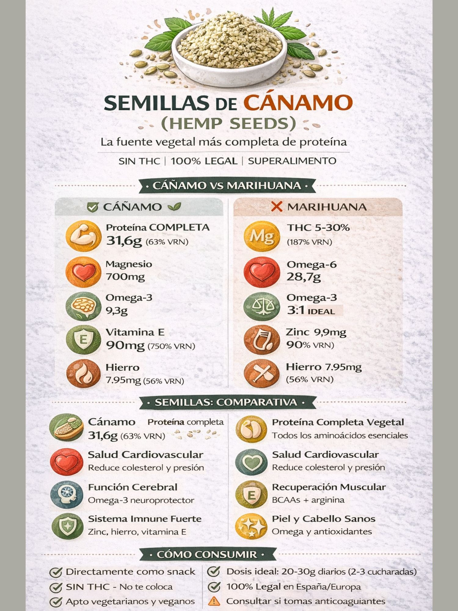 Las semillas de cáñamo son, sin duda, uno de los superalimentos más completos y nutritivos que la naturaleza nos ofrece. Con un impresionante 31-34% de proteína completa, un ratio perfecto de omega-3 y omega-6 (3:1), cantidades excepcionales de magnesio, hierro, zinc y vitamina E, y una digestibilidad superior, estas pequeñas semillas merecen un lugar destacado en tu alimentación diaria.