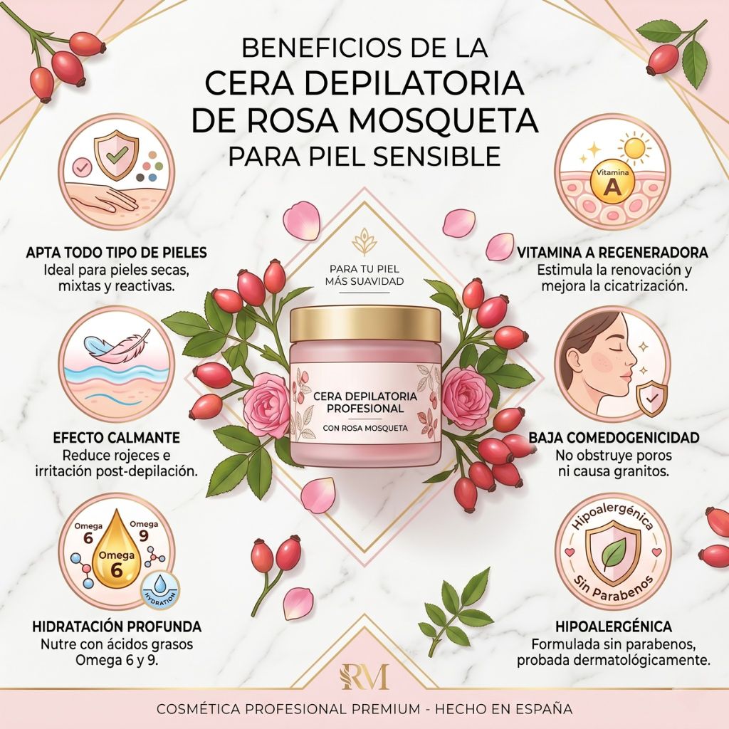 Si tienes la piel sensible y la depilación con cera te genera rojeces, irritación o incomodidad, este artículo es para ti. La cera depilatoria de rosa mosqueta es la solución más completa del mercado para pieles delicadas: no solo elimina el vello de forma eficaz, sino que cuida, calma y regenera la piel al mismo tiempo.