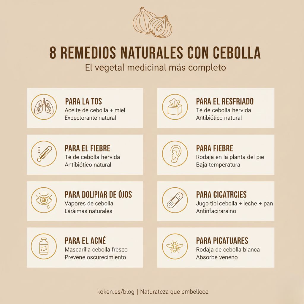 Aceite de cebolla – Expectorante para la tos ✅ Té de cebolla – Cura resfriados en horas ✅ Rodaja en el pie – Baja la fiebre naturalmente ✅ Vapores – Limpia ojos irritados ✅ Trozo en el oído – Antiinflamatorio para otitis ✅ Jugo tópico – Disimula cicatrices ✅ Mascarilla – Elimina acné ✅ Cataplasma – Alivia picaduras de insectos
