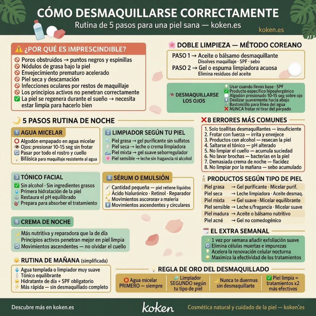 Desmaquillarse correctamente cada noche es uno de los hábitos más importantes que puedes incorporar a tu rutina de belleza. No basta con pasarse una toallita húmeda por la cara: una limpieza facial completa y bien hecha en tan solo 5 minutos puede marcar una diferencia enorme en la salud y el aspecto de tu piel a largo plazo. En este artículo te explicamos por qué es tan importante, cómo hacerlo correctamente según tu tipo de piel y cuáles son los errores más comunes que debes evitar.