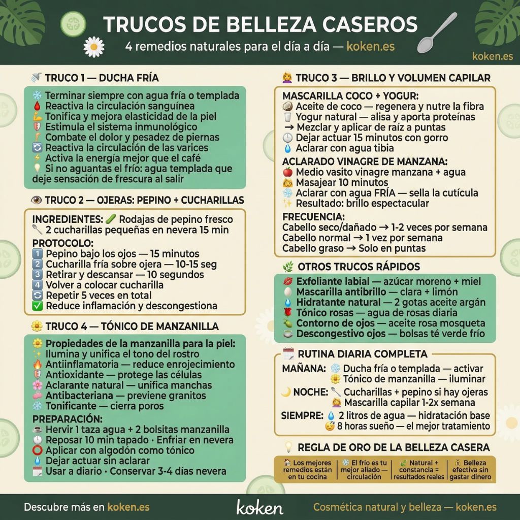 Los tratamientos de belleza profesionales suelen ser bastante caros y no siempre tenemos tiempo de acudir a nuestro centro de belleza tan a menudo como nos gustaría. La buena noticia es que existen sencillos remedios naturales que podemos realizar en casa, en pocos minutos y con ingredientes que probablemente ya tienes en la nevera o en la cocina. Aquí tienes los cuatro trucos de belleza caseros más efectivos para incorporar a tu rutina diaria.