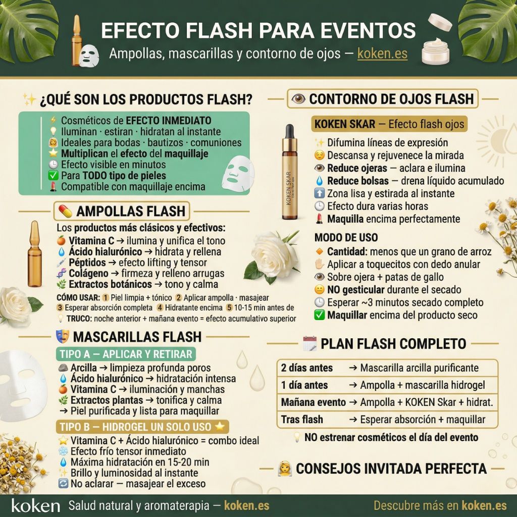 ¿El efecto flash dura todo el evento? Depende del producto. Las ampollas e hidratantes flash suelen durar 6-8 horas. El KOKEN Skar mantiene su efecto durante varias horas y es compatible con el maquillaje que prolonga su efecto. Para eventos muy largos, puedes llevar el contorno de ojos en el bolso para un retoque.